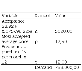In Table 5, we proceed to multiply the number of women who would accept the new product, by the average price of $12.50 with 47.15% and the periodicity of consumption in one year, obtaining a demand of $753,000.00.