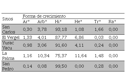 En cuanto a la forma de crecimiento, la mayor cantidad de individuos de especies arvenses presentes en los sitios de San Carlos, El Vergel, Yurac Yacu, La Palma y San Pedro fueron hierbas, con porcentajes de 75,37 a 99,50%. La presencia de helechos en los sitios fue algo notoria, en mayor parte en La Palma con 825 individuos (11,64%), seguido de El Vergel y Yurac Yacu, con 647 y 627 individuos, respectivamente (6,86% y 4,11%). Con respecto a arbustos, se registraron valores de 733 individuos (10,34%) para La Palma, El Vergel con 378 individuos (4,01%) y San Carlos con 302 individuos (3,78%).