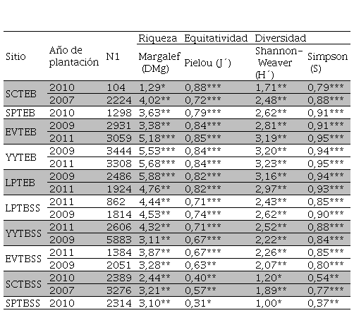 Los valores obtenidos por medio del índice de Simpson muestran que únicamente las plantaciones de teca establecidas en San Pedro en el año 2010 y de San Carlos del año 2010, ambos para el banco de semillas, tuvieron una diversidad media, con 0,37 y 0,54, respectivamente. Los demás sitios registraron una diversidad de especies muy alta, con cifras desde 0,77 a 0,95, como muestra la Tabla 2.