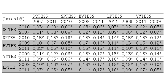 El índice de Jaccard reflejó que las especies encontradas en San Carlos, San Pedro, El Vergel, La Palma y Yurac Yacu, no se parecen florísticamente, debido a que presentan valores bajos que oscilan 0 a 0,18 (x 100%), donde sobresale San Carlos (EB) en interacción con San Pedro (BSS), con un valor igual a 0. Con respecto, a la correlación entre El Vergel (BSS) con Yurac Yacu (EB) y San Pedro (EB), se registraron valores levemente superiores a los otros sitios (0,17 y 0,18 x 100%) (Tabla 3), lo que coincide con Gordon et al. (2018) quienes informaron una baja similitud entre el banco de semillas y la vegetación en pie (15%).