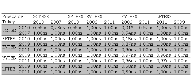 Mediante el análisis de varianza y la prueba de Tukey en función del número de individuos se demostró que no existen diferencias significativas entre los sitios San Carlos, San Pedro, El Vergel, Yurac Yacu y La Palma del estrato bajo y banco de semillas del suelo, puesto que el valor de p (0,115) es mayor al de la probabilidad estadística (≤0,05) (Tabla 3 y 4). Es importante mencionar que la prueba de Tukey resgistró un valor significativo entre los sitios Yurac Yacu 2009 del banco de semillas del suelo, y San Carlos 2010 para el del estrato bajo con un valor de 0,01 (Tabla 20).