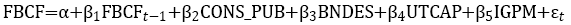(1)sendo: FBCF = investimento privado; CONS_PUB = investimento público; BNDES = crédito fornecido pelo BNDES; UTCAP = utilização da capacidade instalada e IGPM = taxa de inflação (os autores a consideraram como uma variável de incerteza em relação ao futuro). Tem-se que εté um distúrbio aleatório. A teoria econômica sugere que β1>0, β2>0 ou β2<0, β3>0, β4>0 e β5<0.