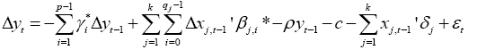 O procedimento de Pesaran e Shin (1999,2001) permite verificar a existência de cointegração entre as variáveis, mesmo que elas não tenham o mesmo número de raízes unitárias3, a partir da estimação da seguinte equação: