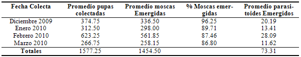 Entre las especies de moscas (Diptera) encontrados se identificó a Themira sp. Robineau-Desvoidy (Sepsidae), Fannia sp. Robineau-Desvoidy (Muscidae), y M. domestica Linneo (Muscidae), que emergieron de los potreros, Leptocera sp., Olivier (Sphaeroceridae), Physiphora sp., Fallén (Ulidiidae), que emergieron de las pilas. Todos los parasitoides que emergieron de la cría de moscas pertenecen al orden Hymenoptera, y son endoparasitoides pupales, los mismos fueron identificados como Spalangia imitator Gibson y Spalangia cameroni Perkins (Pteromalidae), Trichopria sp., Ashmead (Diapriidae) y Kleidotoma sp., Westwood (Figitidae). Aunque no era el objetivo del trabajo se determinó que el grado de parasitoidismo en todos los casos, fue bastante bajo (<5%) (Tabla 1), aspecto que se atribuye a las fechas en que se realizaron las tomas de muestras, que correspondieron plenamente a la época de sequía en nuestro país, donde la incidencia de moscas es baja.