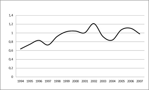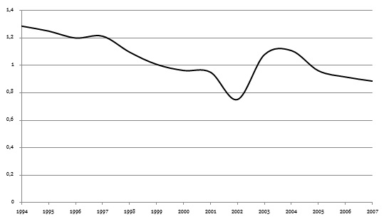 Finalmente, el IMB posee una tendencia negativa, pero menos pronunciada y volátil que la RTA. Cae entre los años 1994 y 2002, del 22% al 1%. En los siguientes años sube al 18%, para retrotraerse al 12% en 2005/06, y crecer al 17% en el último año de la serie.