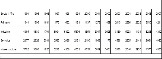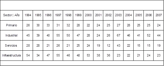 Al inicio de la serie, en 1994, se presenta una fuerte dispersión sectorial. Infraestructura poseía el liderazgo de la RTA promedio anual, luego industria. Alejado se hallaba el sector servicios, y el más deprimido era el sector primario. La RTA promedio del sector primario representaba solo el 24 % de la RTA en el sector infraestructura, servicios la mitad, e industria el 85 %.