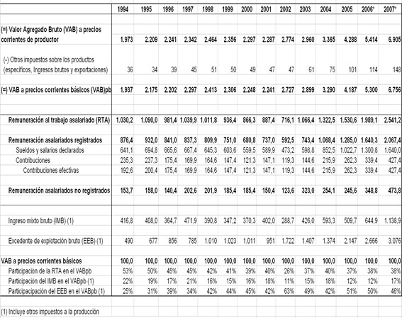 El análisis de la distribución primaria del ingreso surge de la Contabilidad Nacional, específicamente de la Cuenta Generación del Ingreso. En la Cuenta de Generación del Ingreso para la provincia –expuesto a continuación en el cuadro 1, migrado del Informe Final de actividades del CFI5– se pueden observar, en la primera columna, las categorías analíticas que forman parte del estudio (CFI, 2008). El cuadrante superior se inicia con el valor agregado bruto (VAB) a precios corrientes, el cual se extrae de la Cuenta de Producción del sistema de información de las Cuentas Regionales. El VAB se encuentra a “precio productor” y el primer paso consiste en su conversión a “precio básico”, dado que es el VAB a precios corrientes básicos, sobre el cual se realizan las imputaciones que corresponden a los factores productivos.