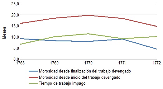 Dada la naturaleza cambiante de la información provista por los documentos del ramo a lo largo de los años aquí analizados, contamos con la posibilidad de calcular la morosidad implicada en el pago de los sueldos vencidos entre 1768 y 1772. Se aprecia, en este sentido, que durante estos años era regular que el pago de los sueldos se demorase 7,9 meses desde la fecha en que había finalizado el trabajo devengado. Este plazo se extiende a 17,6 meses si se computa desde el inicio del trabajo impago. El tiempo trabajado impago promedia entretanto los 9,6 meses. También puede observarse que allí cuando se incrementaba el tiempo de trabajo impago, los oficiales reales procuraban disminuir la morosidad de la paga (se advierte en 1770 y en 1772), quizás con miras a no acumular deudas que redundasen en mayores deserciones.