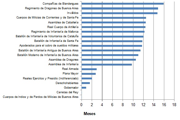 Al evaluar las demoras en las pagas por los distintos cuerpos y unidades receptoras, es claro que la compañía de Blandengues también en este aspecto quedaba relegada en relación al desembolso de recursos del Situado, ya que promediaba los 16 meses de demora en la liquidación de sus remuneraciones. Si los Dragones y el cuerpo de Inválidos la secundaban, debe advertirse que los cuerpos de milicias de Corrientes y de Santa Fe también quedaban habitualmente relegados. No obstante, y pese a estas diferencias en el tratamiento de los cuerpos a la hora de priorizar la liquidación de sus respectivos sueldos, prácticamente todas las unidades, veteranas y milicianas, experimentaban retrasos en sus pagos de entre 10 meses y un año. Que los retrasos en el pago a la Plana Mayor promediasen los 2,7 meses es indicativo de la discrecionalidad que marcaba el ritmo de los desembolsos del Situado para pagas de remuneraciones, inequidad que se suma a las ya mencionadas desigualdades en la distribución de sus recursos.