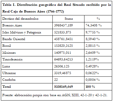 En primera instancia, es sabido que los recursos del Real Situado de Buenos Aires permanecían sólo parcialmente en la ciudad, en la medida en que porciones variables del mismo eran redistribuidas interregionalmente por los oficiales reales de la Caja porteña, en un esquema del que participaban los principales puntos receptores del Situado en Hispanoamérica ( Marichal y Souto, 2012; Pacheco Díaz, 2012). En términos globales ?con datos provistos por Halperín Donghi?, Cuesta ( 2009, p. 132) sugiere que a finales del siglo XVIII (1791-1795) sólo el 28 % de los gastos totales de la Real Caja de Buenos Aires era desembolsado localmente, mientras que un 33 % se habría enviado a la península y el restante 39 % habría sido aplicado en gastos militares para el despliegue de la frontera (Islas Malvinas, Patagonia, Paraguay, expediciones militares). No obstante, las erogaciones del Situado durante los años que abordamos en el presente estudio (1766-1772) no conllevaron una redistribución interregional tan acusada como la que podría llegar a constatarse décadas más tarde.
