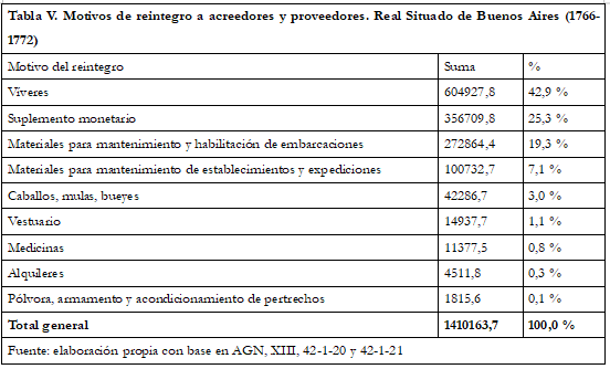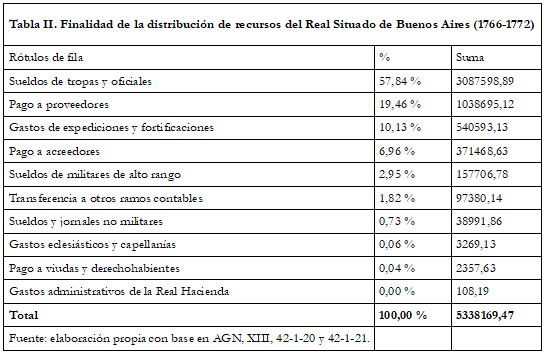 En función de lo antedicho, los sueldos de tropas y oficiales de diferentes unidades militares, veteranas y milicias, adquirieron primacía en la distribución de los recursos del Situado (casi 58 % de las erogaciones). Si los gastos implicados en expediciones y en la erección de fortificaciones tuvieron un lugar relevante (más del 10 %), la utilización de estos recursos para el pago de proveedores y de acreedores de la Hacienda Real en Buenos Aires (que ascienden en conjunto a más de 26 % de los fondos) se posicionan como un renglón explicativo sobre el modo en que eran administrados los recursos del erario.