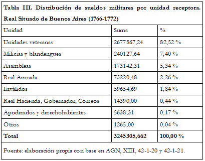 Como puede observarse, los recursos destinados al pago de sueldos de estas tropas y sus oficiales más los aplicados a militares de alto rango (tales como los pertenecientes a las planas mayores) ascendieron a casi 61 % del total de fondos del Situado entre 1766-1772. La distribución de los mismos tuvo por claras protagonistas a las unidades veteranas, muy de lejos seguidas por los cuerpos de milicias (el detalle de las fuerzas que constituían cada segmento puede apreciarse en el Apéndice I). Dadas las estimaciones de efectivos disponibles en cada fuerza, es visible que las unidades veteranas representaban el 36 % de los efectivos de los que la Corona disponía para la defensa y obtenían el 82,52 % de los sueldos militares desembolsados por el Real Situado, mientras que las milicias y los blandengues (que aún no constituían cuerpos veteranos) representaban el 64 % de los efectivos, pero sólo se les otorgaba el 7,40 % de los sueldos militares del ramo del Situado.