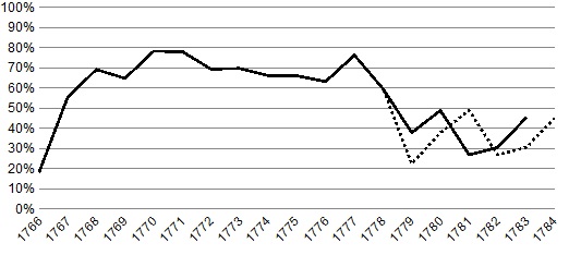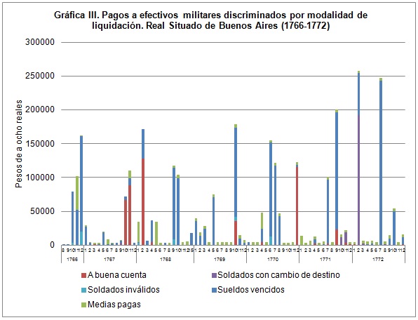 Y cuando volvemos la atención al ritmo de desembolso de esos mismos sueldos, también se advierte que aquel sistemático retraso en la liquidación de los sueldos suponía, en los hechos, un endeudamiento estructural de la Corona con las tropas que defendían su jurisdicción en territorios de frontera. Los efectivos de estas unidades, que nutrían al grueso de la población rioplatense, eran los principales acreedores de una Hacienda cuya morosidad se revelaba insostenible allí cuando se traducía en elevadas tasas de deserción.