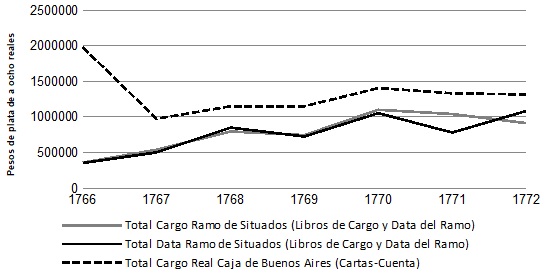 La Guerra de los Siete Años había demostrado a la corona española la necesidad de reforzar la defensa de sus territorios, y el frente portugués ameritaba ese refuerzo en el Río de la Plata ( Biangardi, 2016). Cuando inicia la confección de los libros del ramo de Situados, en agosto de 1766, la Real Caja de Buenos Aires ya había afrontado los gastos del sitio de Cevallos a Colonia en 1762 ( Birolo, 2015, pp. 59, 89; Marchena Fernández, 2014, pp. 20, 21). Aquel año la tesorería de Buenos Aires había recibido situados por $390.000, suma que representaba el máximo caudal remitido al puerto hasta entonces ,y desde al menos 1674, de acuerdo a la información ofrecida por las cartas-cuenta( Klein y TePaske, 2005 [1982, 1986, 1989]).