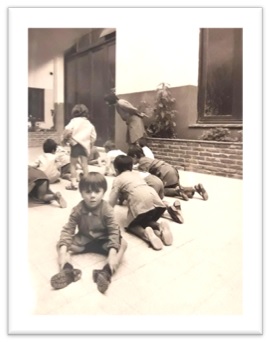 En la imagen es posible observar a un grupo de niños jugando en el patio del colegio posiblemente durante alguno de los recreos. Sin embargo, uno de ellos está en la escena pero no está participando del juego. Ese niño es Rodrigo a quien vemos posar para la cámara desentendiéndose de la actividad central que entretiene al resto del grupo y captura la atención de la maestra. ¿Acaso está en otro juego con la persona que fotografía? ¿Es esta foto un pequeño registro de una forma de inserción periférica?