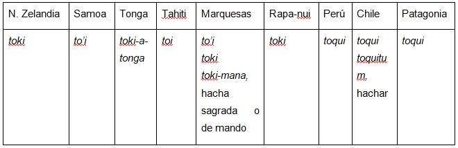 La correlación más conocida propuesta por Imbelloni (a la que dedicó varios artículos y fue discutida en más de una ocasión) es sobre el término término toki, ‘hacha’: