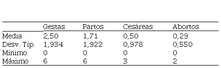 En lo que respecta a los antecedentes obstétricos del grupo en estudio (Tabla 1), este presentó en promedio: 2,5 gestaciones; 1,71 partos; 0,50 cesáreas y 0,29 abortos.
