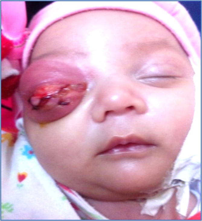 Al examen físico de ingreso presenta un peso de 3.400 gr (percentil 50), talla 49 cm (percentil 15), circunferencia cefálica de 50 cm (percentil 15), signos vitales dentro de la norma para su grupo etario y palidez cutáneo mucosa leve. Además de proptosis de ojo derecho, movimientos oculares conservados en ojo izquierdo, no evaluables en ojo derecho. Aumento de volumen bipalpebral, en ojo derecho que impide en su totalidad la apertura del globo ocular, con signos de flogosis dados por calor, rubor y dolor a la digitopresión. Secreción purulenta en borde palpebral, hiperemia conjuntival. Reflejo fotomotor presente en ojo izquierdo, no evaluable en ojo derecho. Agudeza visual no evaluable. Resto del examen físico sin alteraciones.