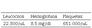 Los laboratorios de los cuales pudo disponerse reportaron 22.300 glóbulos blancos, 651.000 plaquetas, 8.5 mg/dl de hemoglobina con un hematocrito de 25.5 %. (Tabla 1) Por los hallazgos clínicos y paraclínicos se ingresa bajo el diagnóstico de infección de piel y partes blandas: celulitis orbitaria vs periorbitaria de ojo derecho y se indica antibioticoterapia a base de vancomicina (60 mg/kg/día) y cefotaxime (150 mg/kg/día).
