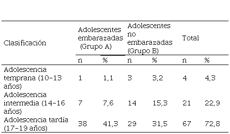 Una vez aplicado el protocolo de estudio, fueron seleccionadas 92 adolescentes, las cuales se dividieron en dos grupos de 46 sujetos cada uno. Como puede apreciarse en la tabla 1, se trataron principalmente de mujeres en la adolescencia tardía (72,8%) o intermedia (22,9%). La adolescencia temprana sólo se registró en 4,3 de la muestra evaluada.