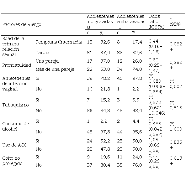 Con respecto, a los factores de riesgos interrogados asociados con la infección por VPH y a las LIE (tabla 2), se pudo obtener que para la edad de la primera relación sexual es el correspondiente a la adolescencia tardía que comprende de los 17 a los 19 años de edad para os grupos de adolescentes embarazadas y no grávidas (82,6%, y 67,4%, respectivamente. Ambos grupos reportan más de una pareja sexual con un porcentaje mayor para el de las embarazadas (74%). Así mismo el antecedente de algún proceso infeccioso vaginal también fue prevalente en los dos grupos de estudio predominando en las embarazadas con 97,8%.