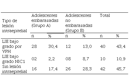 En la tabla 3, se identifica el tipo de LIE en cada grupo de estudio, los cuales están conformado por 46 adolescentes sin embarazo y 46 adolescentes embarazadas, para una muestra total de 92 pacientes; evidenciándose que las LIE bajo grado por VPH, representaron el 43,4% de total de observaciones; predominando en el grupo de adolescente embarazadas (30,4%, n= 28 pacientes). Al asociar las variables incluidas y buscar diferencias entre los grupos mediante la técnica estadística chi2, se observa un valor p= 0,036 al 95% de confianza, con un más del doble de riesgo de presentarse en las gestantes (OR= 2,44; IC95%: 1,05-5,65); estos resultados muestran que las gestantes embarazadas evaluadas tenían un mayor riesgo de presentar lesiones intraepiteliales por VPH que las no embarazadas.