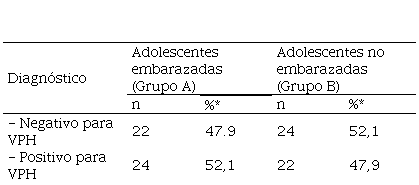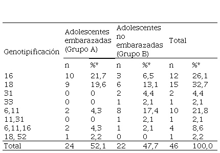 nvestigación comparativa con diseño no experimental, transeccional y de campo, en la cual se estudió una muestra intencionada y no aleatoria conformada por 96 mujeres adolescentes atendidas en la Maternidad “Dr. Armando Castillo Plaza”; las cuales se separaron en dos grupos: embarazadas (Grupo A) y no grávidas (Grupo B). Se incluyeron adolescentes sexualmente activas, con edades entre 13-19 años, reclutadas por diferentes estrategias de convocatoria (bola de nieve, grupos comunitarios organizados y citación por el personal de salud); quienes fueron remitidas a la consulta prenatal o de Planificación Familiar; excluyéndose pacientes con diagnóstico confirmado de cáncer cervical o lesiones pre-cancerosas, con contraindicaciones para la realización de la genotipificación viral y/o la citología cervico-vaginal, y aquellas que no aprobasen la realización de tales procedimientos.