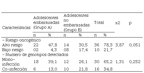 En cuanto a las características de la infección por VPH identificada por PCR, puede observarse en la tabla 5, que del total de pacientes con positividad para VPH el 78,3% presentaban genotipos de alto riesgo oncogénico; predominando en las adolescentes embarazadas (47,8%; n=22/46) en comparación a las no grávidas (30,4%; n=14/46). Asimismo, en 65,2% de las pacientes con PCR positiva solo se detectó un genotipo especifico de VPH (mono-infección), en tanto que la co-infección por diferentes genotipos del VPH se presentó en el 34.8% de los ensayos positivos para VPH; en las gestantes adolescentes prevaleció la mono-infección, en tanto que en las no grávidas fue más frecuente la co-infección.