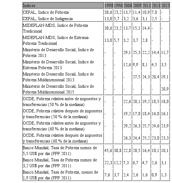 Abstract: Poverty levels in Chile have decreased since 1990, in a context of sustained GDP and family income growth. The intensity of this evolution is controversial based on the different measure methods applied. Absolute, relative, and multidimensional poverty indexes are compared. It is concluded that, based on the same income survey, resulting measures highly depend on poverty definitions. Evidence is presented for the 1990- 2015 period.