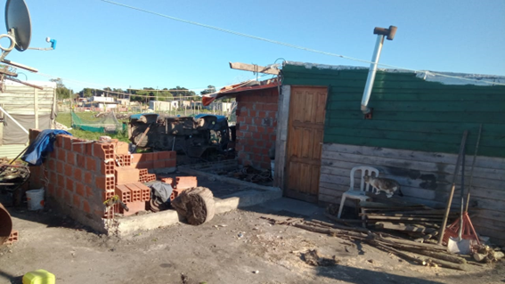A diferencia de Indio, Analía, de 40 años, no había envuelto la casilla. Llegó a Nuevo Golf en febrero de 2020, junto a su hija, luego de separarse de Ernesto, su pareja, con quien vivía en Cerrito Sur. Meses más tarde se “arreglaron” y Ernesto se mudó con su hija a la casilla que, durante los primeros días de febrero de ese año, había levantado Analía con ayuda de su hijo más grande que vivía en el mismo terreno. Después de mudarse, la pareja de Analía había comprado ladrillos, cemento y unos tirantes de madera y construyó una habitación para su hija y la de Analía. Esta construcción la realizó en la parte trasera del lote y contigua a la casilla (figura 2).