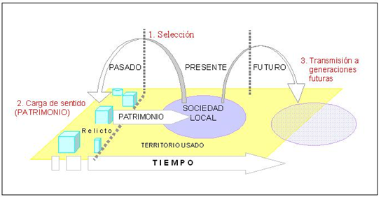 Por ello, aquellos relictos del pasado, formas o espacios supervivientes de los procesos de cambio, esas rugosidades que evidencian un tiempo cristalizado son lo que comúnmente se denomina patrimonio. No obstante, el objeto material por sí mismo no representa el patrimonio ni se transforma en él. Para referir al patrimonio es necesario mencionar dos componentes prioritarios. Por un lado, una escala temporal en la que el presente es el nexo entre el pasado y el futuro, un legado seleccionado que se recibe y que quiere ser transmitido a las generaciones futuras. Por otro, la valoración por parte de un grupo de personas para que los objetos materiales se transformen en elementos culturales del mismo grupo (Figura 1).