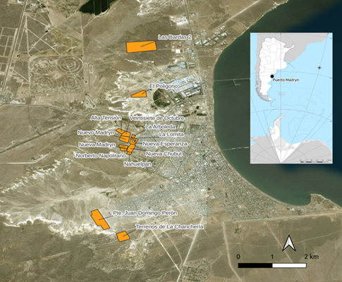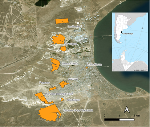 En segundo lugar, en el mapa 2 podemos ver la actualización del relevamiento hecha en 2023, donde constan 9 barrios. Da cuenta de Las Bardas 2 en el extremo norte, El Polígono al norte de la Ruta A010, al oeste de la planta de Aluar, Nueva Chubut hacia el noroeste de la ciudad, Loma Blanca, al centro este, y, por último, al centro oeste de la ciudad los barrios Malvinas, Progreso, San Miguel, Terrenos de la Chanchería y Pte. Juan Domingo Perón.