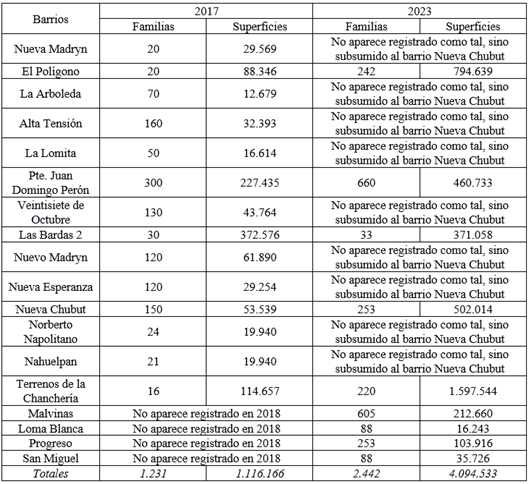 Como cuestión inicial, parte de esta diferencia aparece vinculada al proceso que se dio en torno al Nueva Chubut, un barrio que originalmente concentraba, en su creación y en el relevamiento, 10 barrios distintos, cada uno con su nombre, entre los cuales estaban, según el relevamiento, Nueva Madryn, La Arboleda, Alta Tensión, La Lomita, Veintisiete de Octubre, Nuevo Madryn, Nueva Esperanza, Nueva Chubut, Norberto Napolitano y Nahuelpan. Resulta confuso que las 865 familias, luego queden como 253 acorde a los datos del segundo relevamiento, cuando claramente en términos cartográficos se refiere a los mismos espacios. De hecho, estos 10 barrios suman 313.152 mts2 en el primer relevamiento, lo que resulta menos que los 502.014 mts2 que ocupa Nueva Chubut en el segundo. Esto estaría explicado por la intervención oficial municipal y del PROMEBA, según la cual todo este conjunto de barrios comprende hoy uno solo, el Nueva Chubut. Sin embargo, surge la inquietud de por qué todo ese polígono de intervención sigue siendo caracterizado como un área sin servicios, acorde a la definición del RENABAP de barrio popular, cuando en términos reales quedaron solo algunas manzanas y áreas de expansión nuevas sin los mismos.