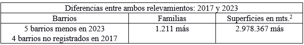 Luego de describir los datos del relevamiento, tal cual fuera publicado en 2017 y los datos actualizados en 2023, hay una serie de cuestiones a comparar que conviene recuperar y explicar a partir de la lectura de los datos (cuadro 2) y la cartografía (mapa 3), por la gran diferencia que surge. Primero, la cantidad de familias es casi el doble en el segundo relevamiento. Segundo, la superficie aparece más que triplicada. Por el contrario, la cantidad de barrios populares identificados es menor, son 5 menos, aún en un escenario donde aparecen 4 barrios que no estaban en el primer relevamiento. Nuevamente, para poder explicar esto, podemos hacer uso de la cartografía, pero también de los datos del relevamiento y del trabajo de campo realizado.