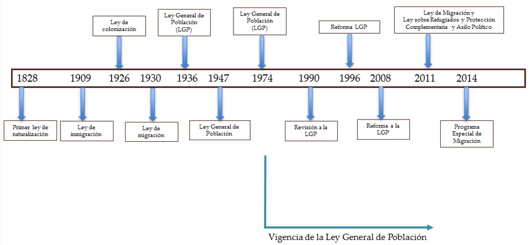 En materia migratoria, México, al igual que la mayoría de los países de la región, cuenta con una política migratoria vigente respaldada por una ley específica. No obstante, hasta hace algunos años, la gestión de la migración se encontraba regulada principalmente a través de la Ley General de Población, lo que limitaba un enfoque más especializado. En el año 2011, aparece la ley de migración y en 2012 su reglamento, la cual, aunque ha sufrido modificaciones, se encuentra vigente en la actualidad (Figura 3).