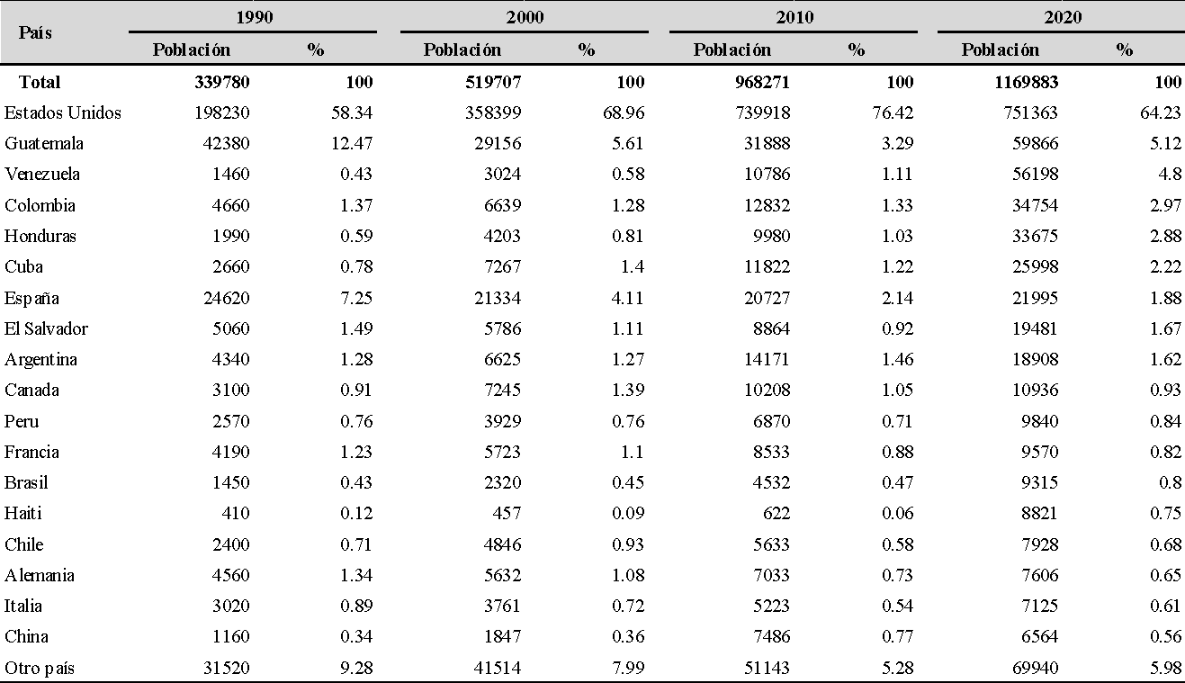 De acuerdo con los datos de los últimos cuatro censos de población, el número de extranjeros residentes en México ha ido en aumento. En 1990, la población extranjera representó 0,4% del total de la población censada, cifra que para el 2000 alcanza 0,5%, mientras que en 2010 y 2020 constituyó un 0,9% aproximadamente, lo que actualmente equivale a poco más de un millón de personas extranjeras residiendo en México (Tabla 1). La mayor parte de esta población proviene de Estados Unidos y de países ubicados en regiones como Centroamérica, Sudamérica y el Caribe, con una significativa presencia de personas de origen europeo.