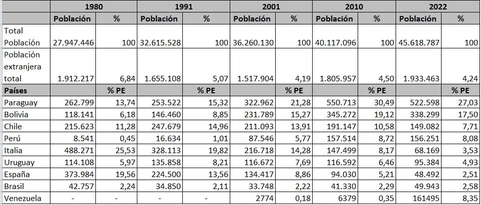 De modo sintético, es posible afirmar que la Argentina es, desde al menos su primer registro censal oficial en 1869, un país con una importante presencia extranjera y lo sigue siendo, aunque con evidentes cambios, tanto en la composición migratoria como en la variación respecto al peso relativo de esta población dentro de su total. De un perfil eminentemente europeo de su migración entre fines del siglo XIX y la primera mitad del siglo XX, se ha ido consolidando una latinoamericanización de la migración de modo progresivo durante toda la segunda mitad del siglo XX. Esto se evidencia en el Tabla 2 donde se identifica a partir de 1991, y con mayor contundencia en los censos de población subsiguientes (2001 y 2010), un descenso en el número de migrantes europeos, que fueron envejeciendo progresivamente. Así, de modo paralelo a aquella declinación, los extranjeros oriundos de países vecinos presentaron una participación numérica y porcentual superior, de tendencia creciente.