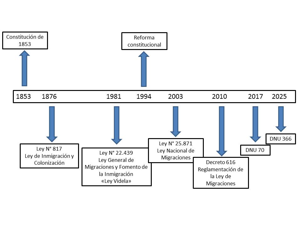 La Constitución de la Nación Argentina contiene referencias a la promoción de la migración desde su mismo preámbulo que incluye a partir de 1853 la mención: “asegurar los beneficios de la libertad para nosotros, para nuestra posteridad, y para todos los hombres del mundo que quieran habitar en el suelo argentino” (República Argentina, 1995, p. 1). Luego de la reforma de 1994 este preámbulo no fue modificado. Tampoco cambiaron los distintos artículos que refieren a los derechos fundamentales para las personas extranjeras (artículos 14, 16, 20 y 25); el último de ellos ha resultado especialmente cuestionado por su selectividad, a partir de su explícita mención “El Gobierno Federal fomentará la inmigración europea”. Si bien este artículo continúa vigente, en una clara preferencia por aquella migración tradicional de ultramar, la actual Ley de Migraciones ha significado un cambio sustancial en el devenir de la concepción de la migración en la normativa. Sin embargo, para poner en perspectiva la actual ley es preciso hacer referencia a sus dos predecesoras (Figura 4).