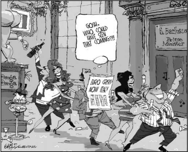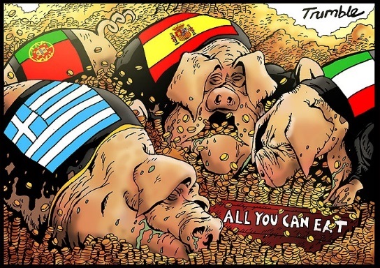 Debido a que el Banco Central Europeo (BCE) ha sido organizado bajo estrictas normas e ideología neoliberales, los países del sur no podíamos tomar más préstamos de éste como último recurso. Si bien otros bancos centrales en el mundo funcionan como prestadores de último recurso, el BCE no cumple esa función. Cuando la crisis de los Estados Unidos llegó a Europa alrededor de 2008 golpeó primero al eslabón más débil, que era Grecia, y para 2010 la burbuja inmobiliaria estalló. Por lo tanto, hasta ahora he tratado de argumentar por qué la deuda pública no es suficiente como explicación de lo que pasó en el sur de Europa y con la crisis en general en el continente. Pero cuando la crisis llegó, y cuando la Unión Europea junto con el Fondo Monetario Internacional y el Banco Central Europeo organizaron la llamada troika (porque eran tres diferentes fuerzas combinadas), comenzaron una fuerte guerra ideológica contra los pueblos del sur de Europa. Esto fue extremadamente importante, dado que intentaron legitimar las medidas de ultraausteridad que se estaban aplicando. Como sabemos, el neoliberalismo es una gran arma ideológica, porque controla un lenguaje y una simbología particulares. Fuimos acusados de amar la dolce vita, como en la viñeta que les estoy mostrando (figura 1). O bien usaron el acrónimo PIGS [cerdos, en inglés], que significa “Portugal, Italia, Grecia, España [Spain, en inglés]”, y aquí podemos ver cómo los cerdos se comen el dinero europeo sin importarles nada (figura 2). Creo que estas dos imágenes, y otra que les voy a mostrar al final, ilustran la imagen general y el sentimiento de las diferentes culturas que se enfrentan ante un problema en Europa. Esta imaginación geográfica presenta dos polos diferentes: uno es el de la gente perezosa del sur de Europa, que no trabaja lo suficiente y gasta más de lo que puede producir, y el otro, el de los industriosos del centro y norte de Europa, que no gastan dinero y producen mucho.