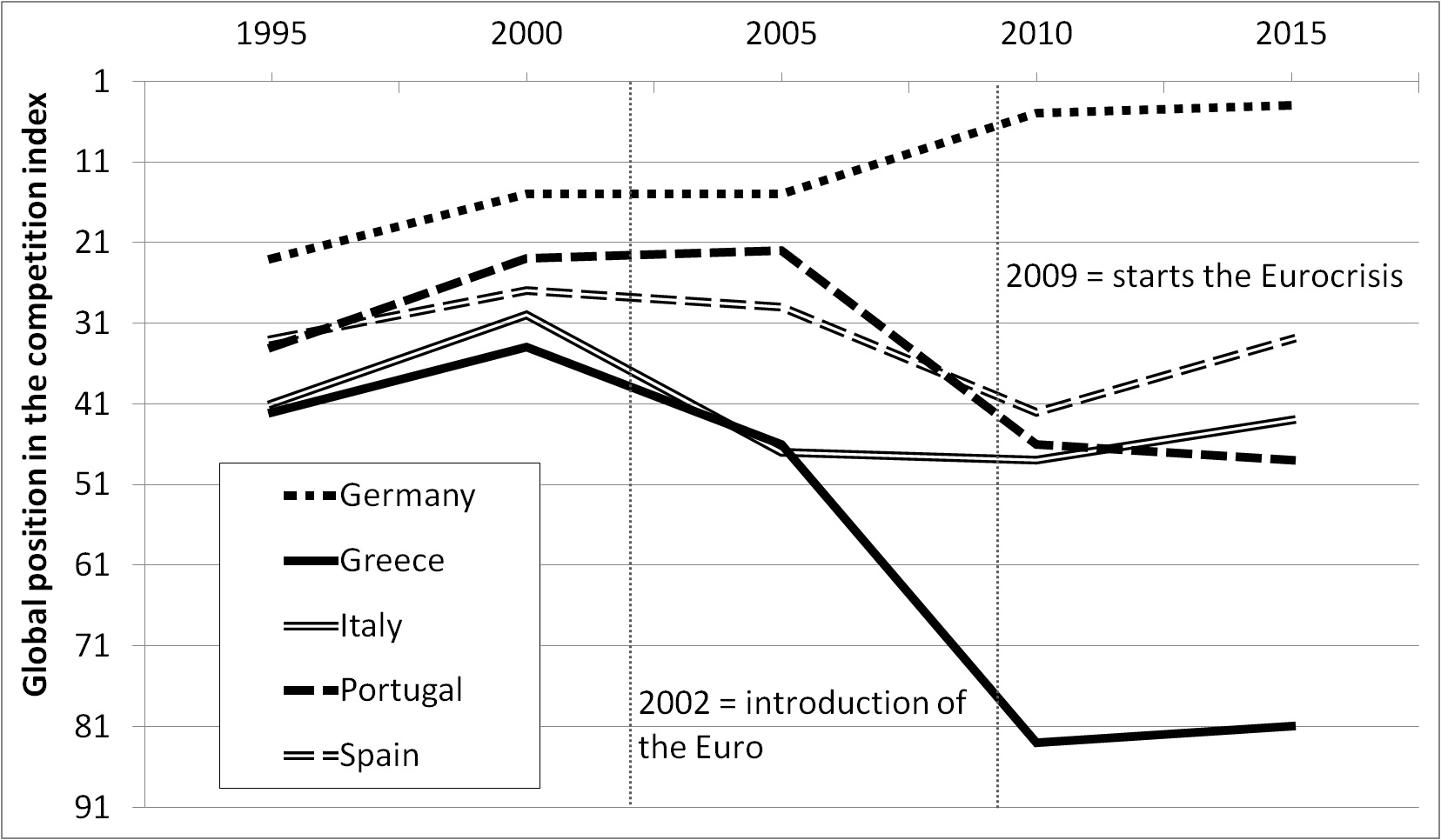 Como dije previamente, los países del sur de Europa entraron a la zona euro ya con estructuras económicas muy débiles. Inmediatamente, ya para mediados de los noventa, comenzaron a perder competitividad. Su situación se deterioró aún más con la introducción del euro en 2004, y ya en 2009, cuando empieza la crisis, vemos (como indica el gráfico 1) las diferencias entre Alemania (que sigue incrementando su competitividad) y los Países Bajos, Irlanda, España, Portugal, Italia, y sobre todo Grecia, que sufren una fuerte caída mayor de su competitividad.