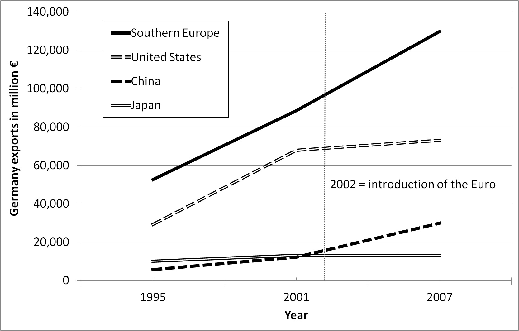 Considerando todo esto, ustedes pueden preguntarse por qué los alemanes, por ejemplo, permitieron que los países del sur de Europa entraran al euro, ya que era evidente que iba a resultar una estructura muy inequitativa e inestable. La respuesta es obvia: el sur de Europa era el principal mercado para las exportaciones de Alemania. El gráfico 2 es un interesante diagrama que muestra que desde 1995 hasta 2007 (antes de la crisis) el sur de Europa es el mayor consumidor de los productos industriales alemanes, muy por encima de los productos de Estados Unidos, China y Japón (esto es, intercambios comerciales en términos de valor económico, no de volumen).