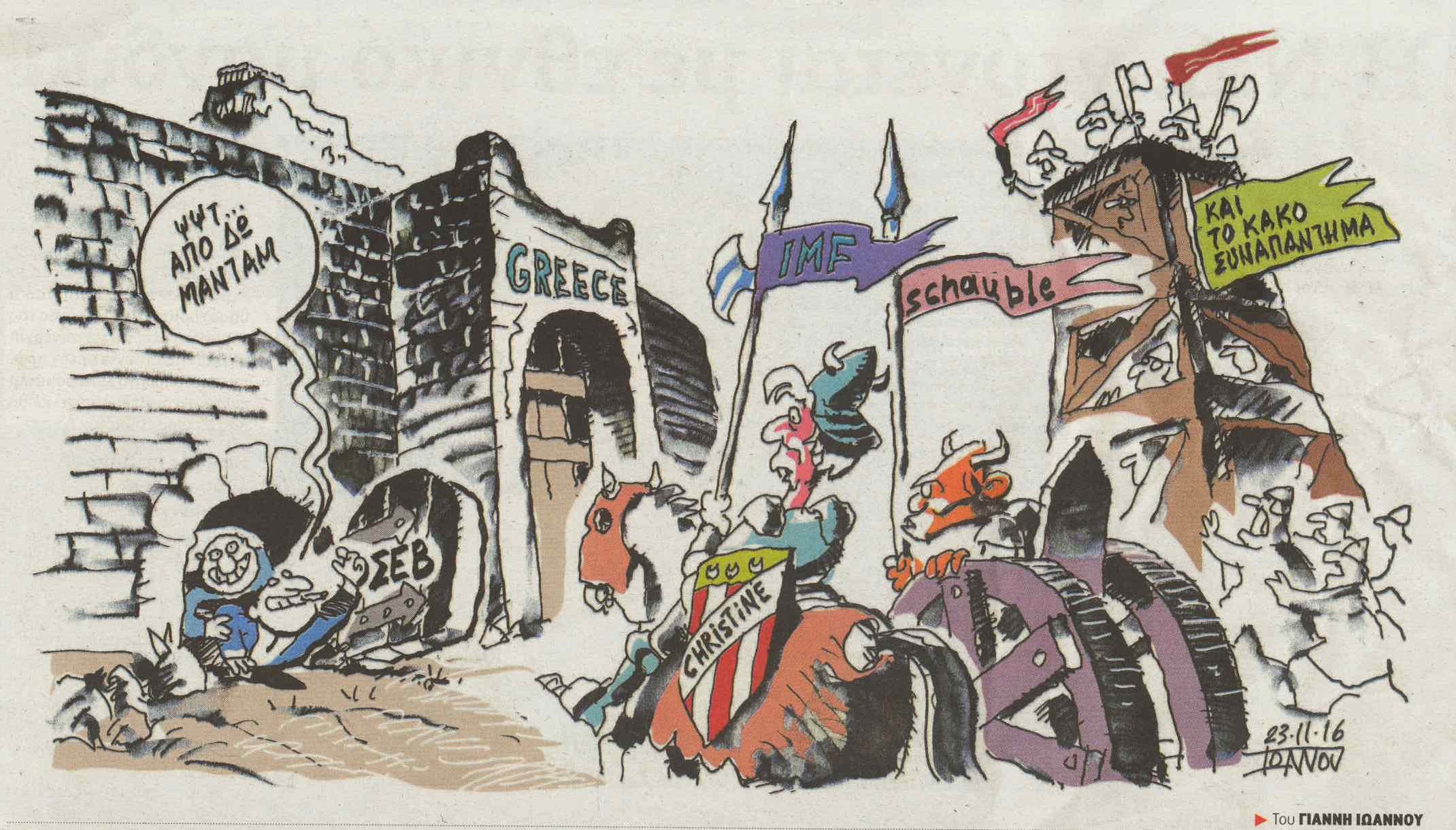 Pero debemos ser muy cuidadosos de no culpar solamente a las fuerzas políticas externas y a la burguesía, a Alemania, a los Países Bajos, al FMI… Okey, esos son los chicos malos. Pero, ¿qué pasa con la burguesía doméstica, con los chicos malos domésticos que son parte de la historia? Porque a lo largo de estos años se volvió muy claro que la burguesía doméstica estuvo esperando la crisis, como un regalo de los dioses, en aras de implementar todas esas políticas en contra de los trabajadores que hubieran sido imposibles de aplicar bajo normas verdaderamente democráticas. Hay un eslogan muy conocido que dice que las crisis generan oportunidades. Pero, ¿oportunidades para quién?, ¿y a qué costo? Voy a terminar con esta caricatura sobre Grecia (figura 3). Aquí pueden ver a Christine Lagarde, del FMI; el doctor W. Schӓuble, ministro de finanzas de Alemania; y éste [señala la imagen] es un ejército medieval tratando de atacar el castillo de Grecia. Pero aquí está la burguesía griega, que abre una pequeña puerta, y dice “¡pst! ¡Pasen por aquí! Este es el camino más simple”.