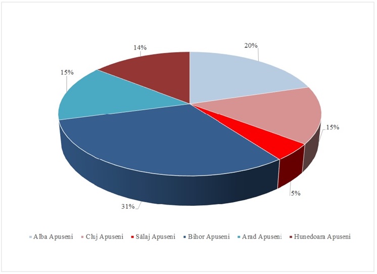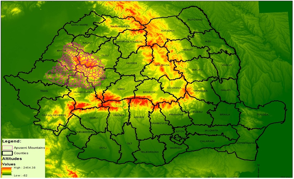 The Apuseni Mountains (figure 1) represent an expanded mountain unit on about 10.750 km2 and is part of the Romanian Carpathians. The northern boundary of the mountains is given by the Barcăului Valley, the eastern boundary of contact with the Transylvanian Depression, in the south the boundary is given by the Mureş Valley, and in the east the limit is one sinuous to the connection with the West Hills. In the central part there is a higher area with altitudes of more than 1.800 meters (Vlădeasa, Bihor and Gilău-Muntele Mare) followed by a lower area (Pop, 2000). The process of heightened humanity of the Apuseni Mountains has been carried out over historical times, with continuity and cyclicality in the populating of these mountains. The settlements were placed in depressions, followed by the demographic pressure to spread across the valleys and reach altitudes of more than 1.200-1.300 feet.