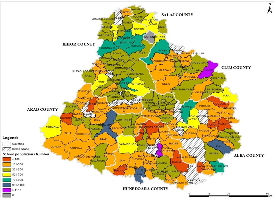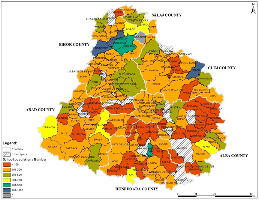 Due to the fact that the Apuseni Mountains largely comprise the rural area, the number of rural pupils is somewhat higher than the pupils in the urban environment. The spatial distribution of the number of school population for each common is represented in figure 3. In the year 1992, in the rural mountains, there was a school population of 48.851 students.