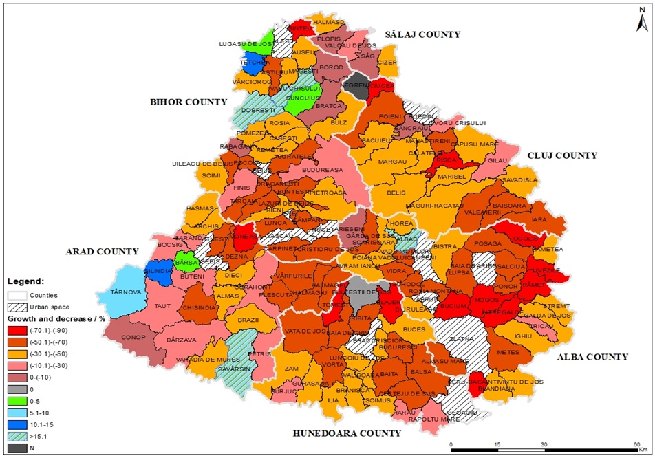 In figure 6 we made a cartographic representation of the increases and decreases of the school population in 1992-2017. Decreases dominates clearly, with very high values being recorded. No less than 13 municipalities had decrease of the school population over 70 %, but most of the decreases are between (-30.1)-(-70) %. These values are distributed in the entire area of the Apuseni Mountains, both in the high mountain areas and in the marginal areas at the contact of the mountain area with the hill area, of depression.