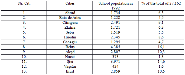 In 1992, the herd of the school population of the 13 cities was 27.162 students. The largest number of pupils was registered in the town of Beiuş in Bihor County, and the opposite pole was the town of Nucet in the same county with only 373 students. Under the percentage aspect, only four cities passed as a total share of more than 10 %. The city of Beiuş held 16,1 % of the total pupils, followed by Ştei by 14,6 % and Brad by 10,5 % and Aleșd by 10,3 %.