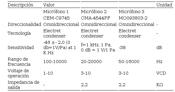 Se adquirieron tres micrófonos electret para las pruebas de adquisición de señal, con las características de la Tabla 1 y se seleccionó el modelo CMA-4544PF, que posee un rango de frecuencia de trabajo de 20-20000 Hz, cuyo límite inferior es el parámetro de mayor ponderación para su elección, debido a que los sonidos cardiacos se encuentran en valores de frecuencia entre 20 y 250 Hz, y los soplos entre 100 y 750 Hz de acuerdo a la literatura.