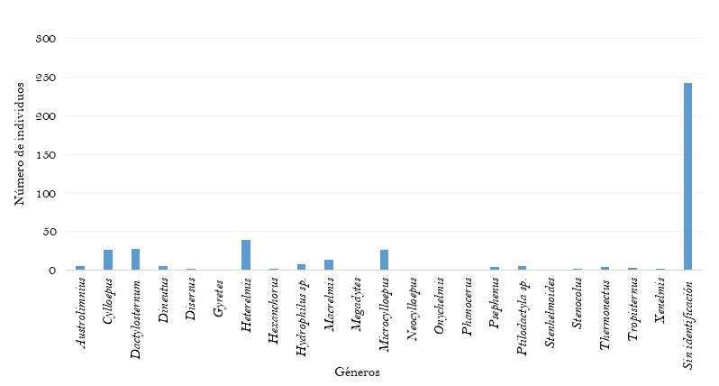 En la colección de coleópteros acuáticos del MEFLG, la familia Elmidae presentó el mayor número de géneros (12). Los géneros con mayor número de especímenes fueron Heterelmis Sharp (39 especímenes), Cylloepus Erichson y Microcyllopeus Hinton (27 especímenes cada uno) (Figura 4). Esto coincide con lo reportado en el Sistema de Información sobre Biodiversidad de Colombia (SIB) para la colección de macroinvertebrados acuáticos de la Universidad Católica de Oriente (CMA-UCO), en la cual la familia Elmidae tiene mayor representación dentro de la colección de acuerdo al número de individuos (Universidad Católica de Oriente, 2015).