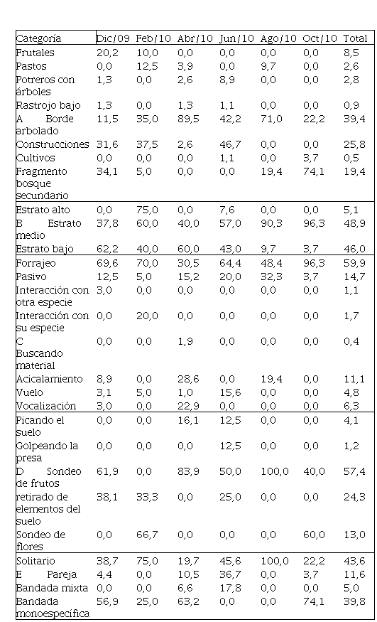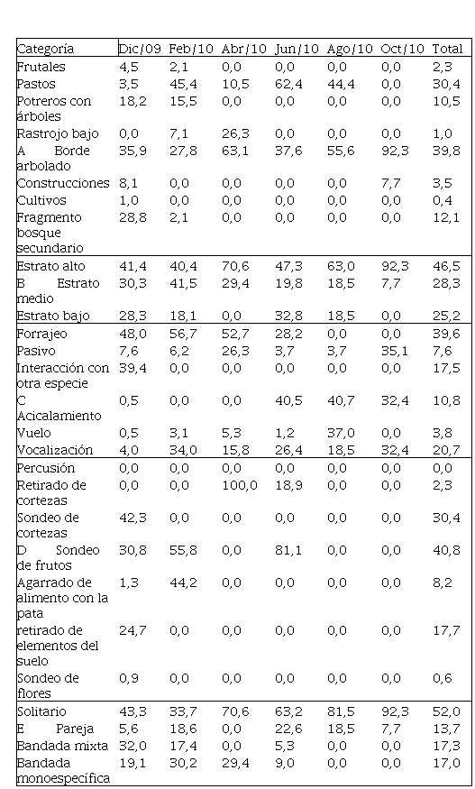 La actividad más desarrollada por la especie fue el forrajeo con 29 registros y un 39,6% del total de tiempo observada. Sin embargo, esta actividad sólo fue importante en los muestreos de diciembre, febrero y abril, mientras que en el mes de junio descendió a un 28,2% y en agosto y octubre, donde solo hubo 7 registros, no se observó la especie en esta actividad, sino en actividades de acicalamiento y vocalización. La interacción con individuos de otras especies se presentó únicamente en el mes de diciembre (39,4%) (Tabla 1C).