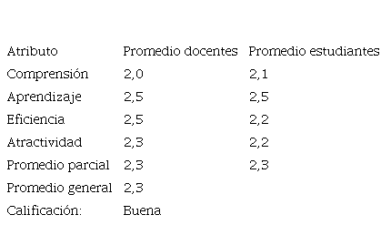 En conclusión, los resultados de la evaluación por los docentes expertos, se puede resumir en la tabla 9, donde se muestra el comparativo por atributo, teniendo en cuenta que la máxima ponderación es 5.0 y la mínima es 0.0. Los dos evaluadores coincidieron en que el atributo con mayor cumplimiento es Comprensión, y Aprendizaje es el de menor porcentaje de cumplimiento.